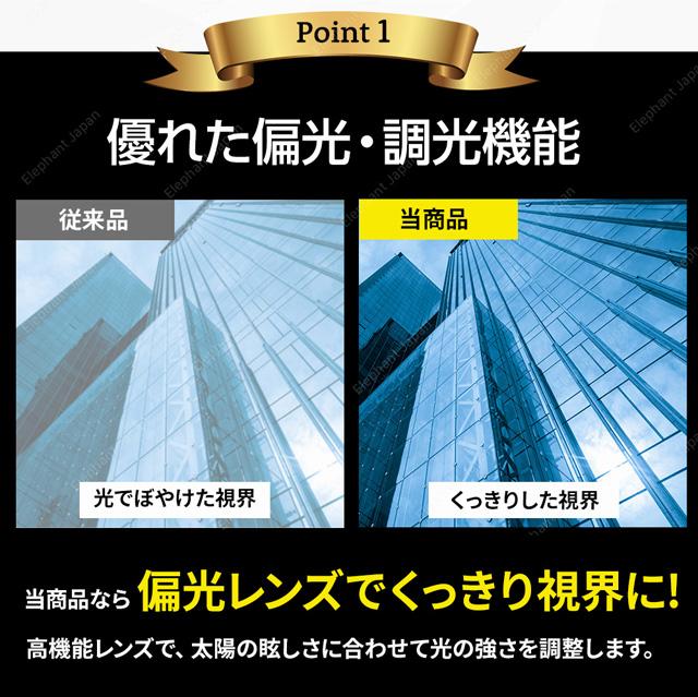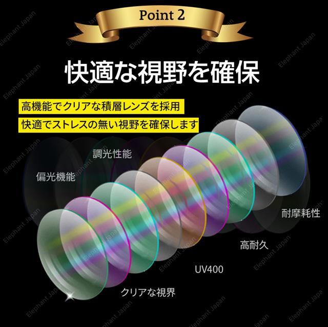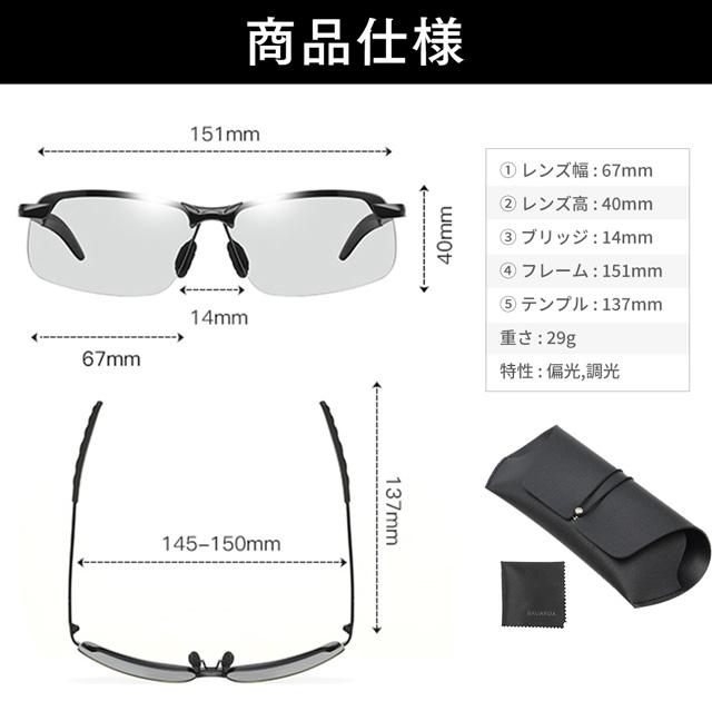 | 【商品仕様】 | セット内容:サングラス本体、専用ケース、レンズクロス、メガネ用曇り止め レンズ特性:UV400/調光/偏光 |