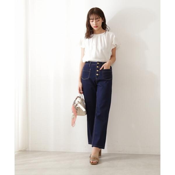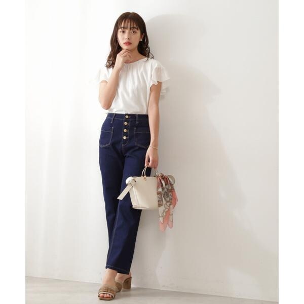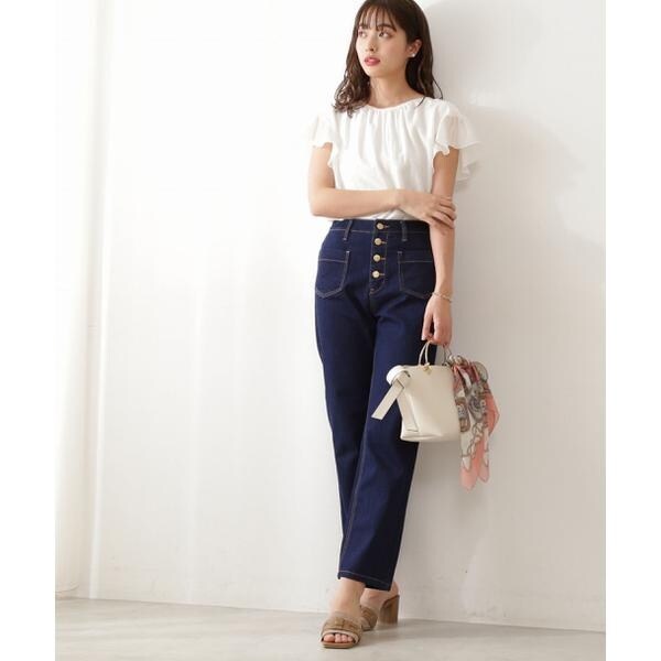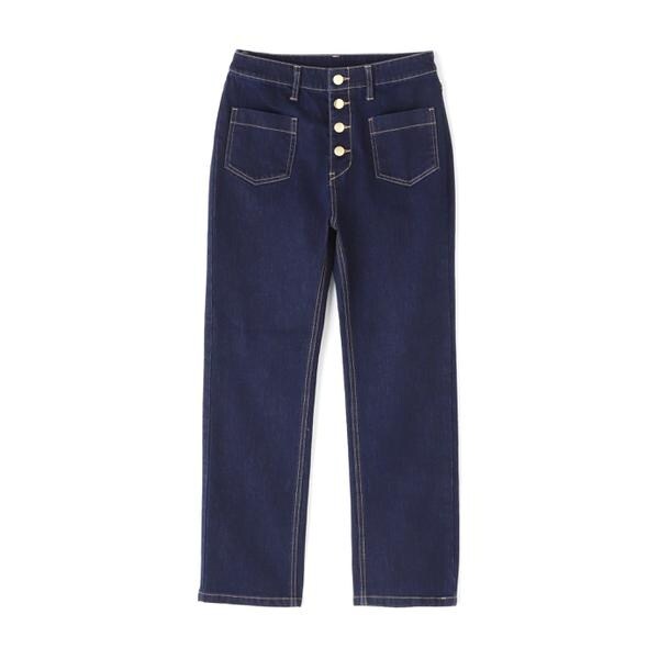【商品特徴】すっきりとしたストレートラインのデニムパンツです。フロントボタンとポケットが目を惹くポイントです。フロントに表情があるので腰周りをすっきり見せてくれます。大人カジュアルなコーディネートにおすすめのアイテム。【スタイリング】カラーリブニットやオーガンフラワーブラウスと合わせると、今年らしいコーディネートにアップデートできます。