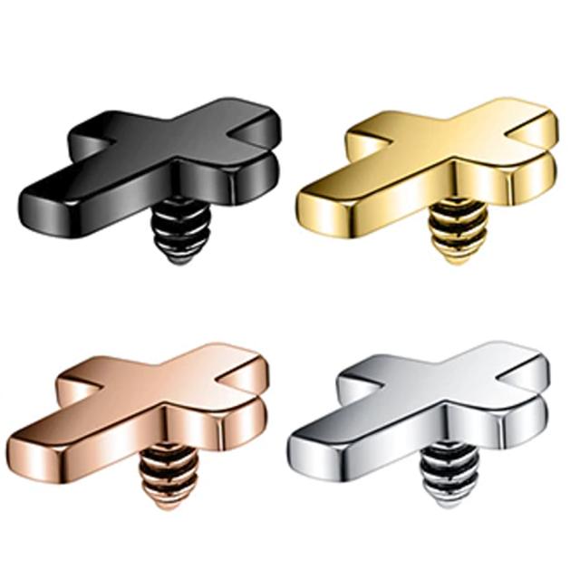 ステンレス素材の十字架を黒色ブラック、銀色シルバー、金色ゴールド、ピンクゴールドにメッキしたスタイリッシュな14ゲージの内ネジタイプのボディピアス用キャッチ。
