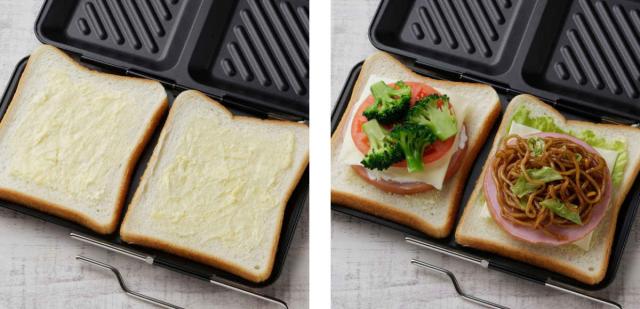 1度に2個焼けるので、お子様のいるご家庭や数人分の調理におすすめです。左右で違う具材を挟めば2種類のホットサンドが同時に焼けて便利です。