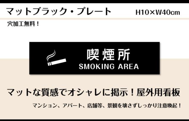 両面テープ付き 喫煙所 SMOKING AREAプレート 看板 マットブラック H10×W40cm シルバーアルミ複合板 屋外 la10-21-r