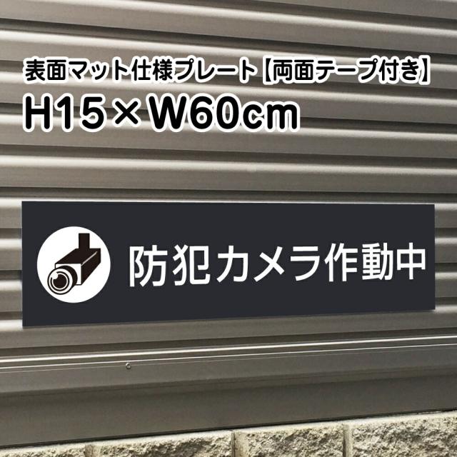 両面テープ付き 防犯カメラ作動中プレート 看板マットブラック H15×W60cm シルバーアルミ複合板 屋外 黒 bla15-1-r