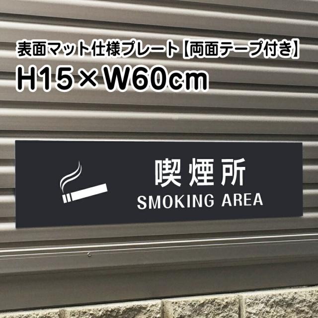 両面テープ付き 喫煙所 SMOKING AREAプレート 看板 マットブラック H15×W60cm シルバーアルミ複合板 屋外 bla15-21-r