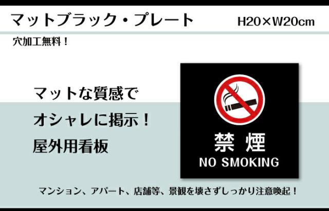 両面テープ付き 禁煙 NO SMOKING プレート 看板 マットブラック H20×W20cm シルバーアルミ複合板 屋外 黒 bla20-19-r