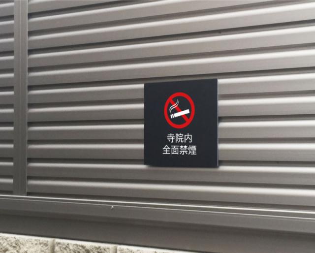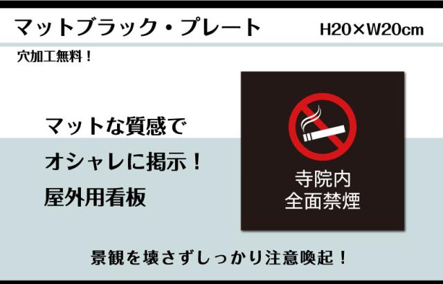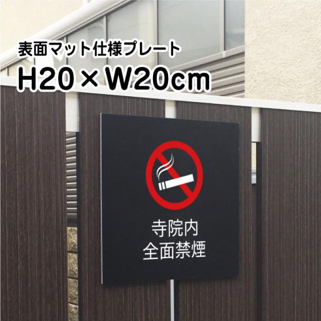 寺院内全面禁煙 プレート 看板 マットブラック H20×W20cm シルバーアルミ複合板 黒 室内プレート 参拝 神社 寺院 屋外 bla20-25