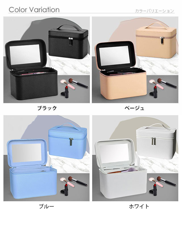 - ブルーを買いましたが、表面の素材が綺麗で発色もいいです。容量はたっぷり入ります。持っているコスメが全て入りました。ボトル類の高さから、トレーは中に入れずに個別に使うことになりますが、メイク用品が整理できます。ただ、化粧品のボトルによっては立てて入れると蓋が閉まらないこともあるかもしれません。蓋の内側の鏡の厚さがあるので。欲を言えば、鏡がもっと手前に引き出せる仕様だったらもっと良かったです。