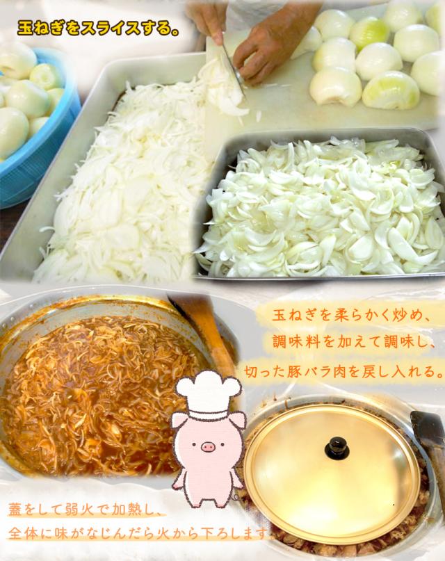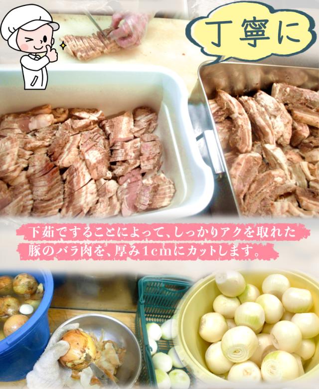 【原材料】豚肉(国産)、玉葱、醤油、砂糖、風味原料(かつお、さば)、清酒、発酵調味料、ワイン、リンゴ酢、食塩、調味料(アミノ酸等)、(一部に小麦・大豆・豚肉・リンゴ・さばを含む)