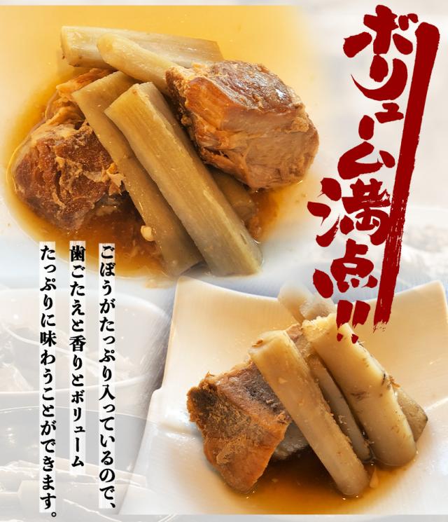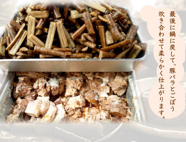 【原材料】豚肉(国産)、野菜(ごぼう(国産)、生姜)、醤油、砂糖、清酒、風味原料(かつお、いわし、こんぶ)、発酵調味料、食塩、調味料(アミノ酸等)、(一部に小麦・大豆・豚肉を含む)