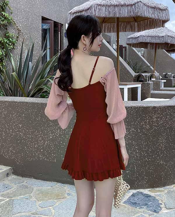 2WAY ワンピース水着 レディース オフショルダー 水着 長袖 体型カバー 大きいサイズ 3 4 5 6 セクシー ワンピース ノンワイヤー 着痩せ 盛れる ママワインレッド ぽっちゃり 韓国 可愛い 温泉 ビーチ プール 海 水泳 女性用 大人 オトナ女子