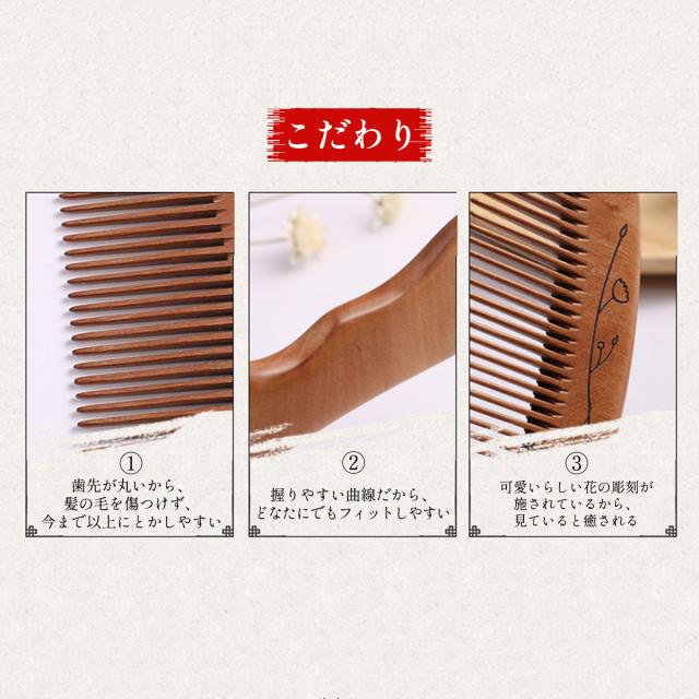 安価な桃木櫛の歯先より当店の櫛の歯先は丸いから、髪の毛を傷つけない