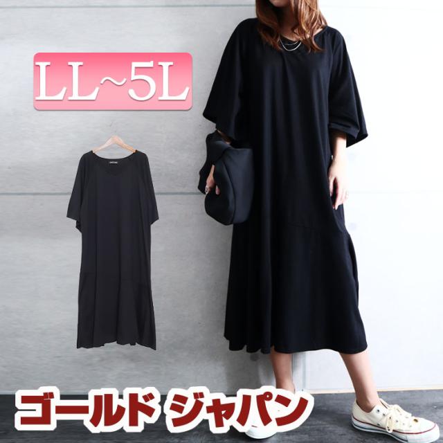 秋新作 大きいサイズ レディース ワンピース カットソーティアードワンピース ワンピ ロングワンピース ティアードワンピース ロング フレア Vネック ティアード ストレッチ カットソー 5分袖 半袖 フレア袖 ルーム 春服 夏服 LL 2L 3L 4L 5L ブラック 黒 ゴールドジャパン