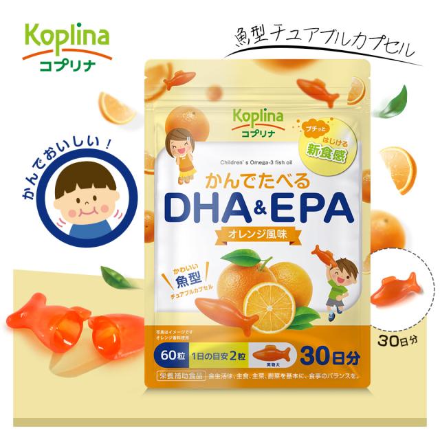 ●【プチっとはじける新食感】かわいい魚型ソフトカプセルにDHA・EPAのオイルを閉じ込めた、かんで食べれるソフトカプセルを使用しております。さわやかなオレンジ風味で、成長期のお子様をサポートします。