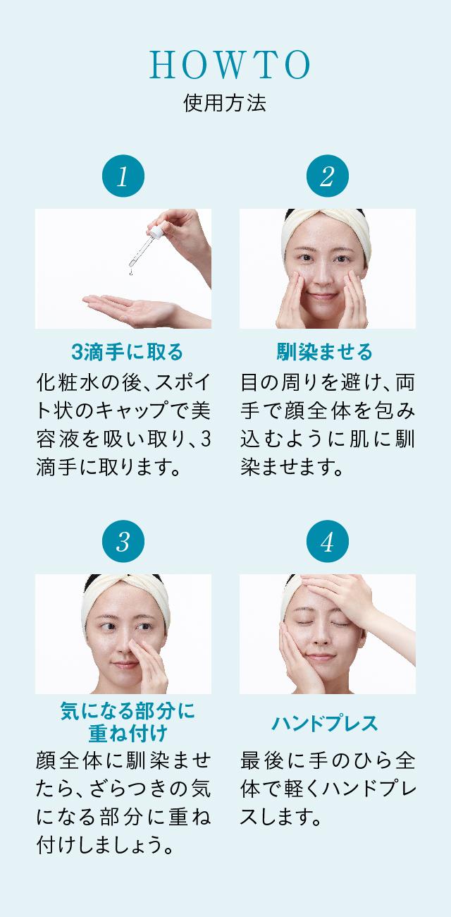 | 使用方法 | 化粧水の後、スポイト状のキャップで美容液を吸い取り、2~3滴手に取ります。目の周りを避け、両手で顔全体を包み込むように肌に馴染ませます。顔全体に馴染ませたら、ざらつきの気になる部分に重ね付けしましょう。最後に手のひら全体で軽くハンドプレスします。 |