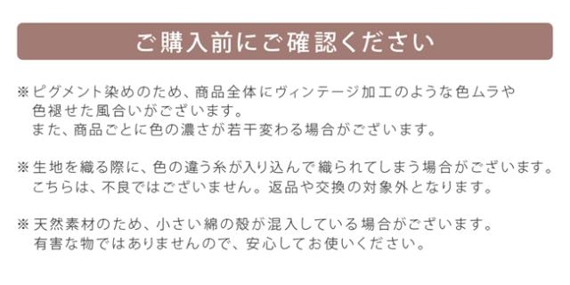| 【ピグメント染色加工について】 昔ながらの自然な染色方法(生地の表面のみ染色される)により、生地仕上げや縫製部分が色褪せたような独自の色合いが特徴です。 色が濃いほど色褪せたような色合いが発生しますが、こちらは特有の風合いとなります。 また、染色時期によって同じ商品でも多少の色差が生じる場合がございます。 【お取り扱い上の注意】 ※染料の性質上、使用時の摩擦により色落ちすることがありますので、ご注意ください。 ※水洗いは可能ですが、洗濯機・乾燥機のご使用はお避けください。 ※素材の特性上、多少の色落ちや毛羽立ちが発生する場合があります。色移り防止のため、他のものと分けて洗濯ください。 ※洗濯後は、湿った状態で放置せず、直ぐに形を整えて干してください。 ※漂白剤は使用しないでください。変色の原因になります。 ※天然素材のため、小さい綿の殻が混入している場合がございます。こちらは有害な物ではありませんので、安心してお使いください。 ※生地を折る際に別の糸が入り込んで、一緒に織り込まれる場合がございます。こちらは返品や交換の対象外となりますので、ご了承ください。 |