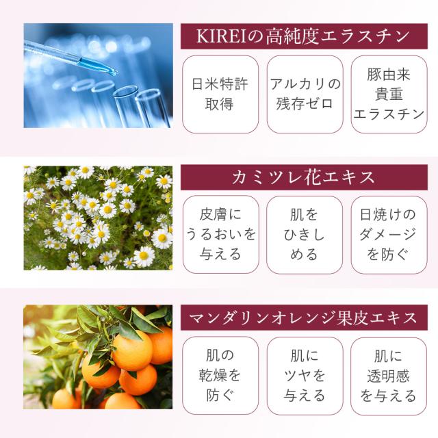 | 成分 | 水、ベンチレングリコール、加水分解エラスチン、グルコシルナリンギン、ナリンギン、マンダリンオレンジ果皮エキス、カミツレ花エキス、セイヨウオトギリソウ花/葉/茎エキス、トウキンセンカ花エキス、フユボダイジュ花工キス、ヤグルマギク花エキス、ローマカミツレ花エキス、クエン酸Na、クエン酸、カプリル酸グリセリル、PEG-62水添ヒマシ油、BG |
