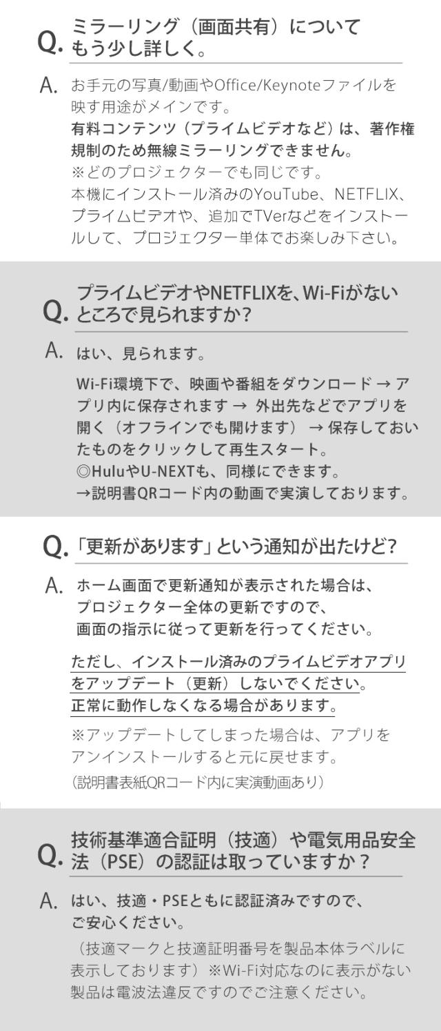 YouTubeの他 Netflixやプライムビデオが最初からインストールされているので、届いてすぐにお気に入りのアニメや映画を見られます。今はスクリーンで見ることができない古い映画を大画面で(貴重)。プロジェクターにスピーカー内蔵のため、一台で完結!