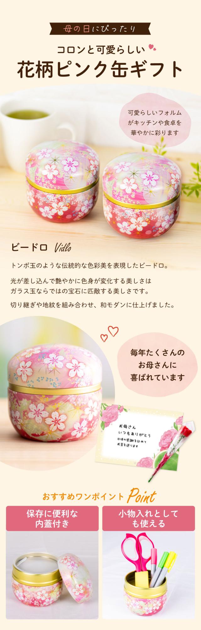 【超早割:ポイント10%】 母の日 ギフト お茶 花柄缶 ピンク 2本箱入 ミニカーネーション メッセージカード 静岡茶 茶葉 緑茶 ほうじ茶 ビードロ缶 人気 深蒸し茶 お茶の葉 50代 60代 70代 80代 プレゼント