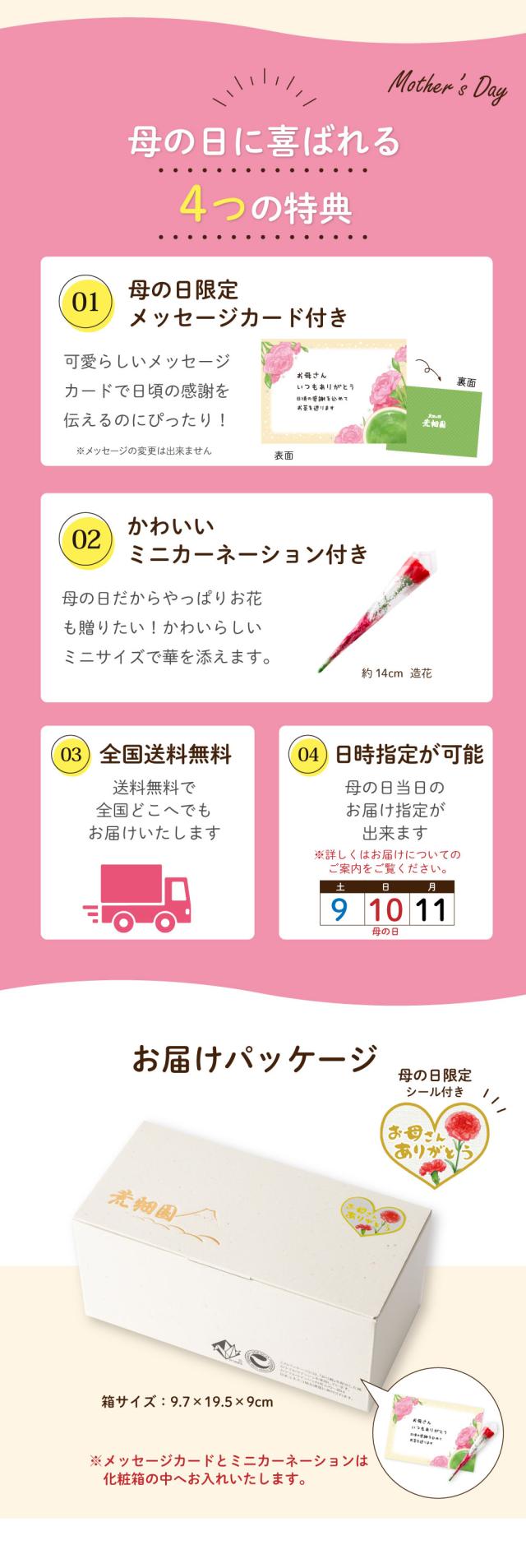 母の日メッセージカード×1枚、ミニカーネーション(造花)×1個 【箱サイズ】19.5×9.5×9cm
