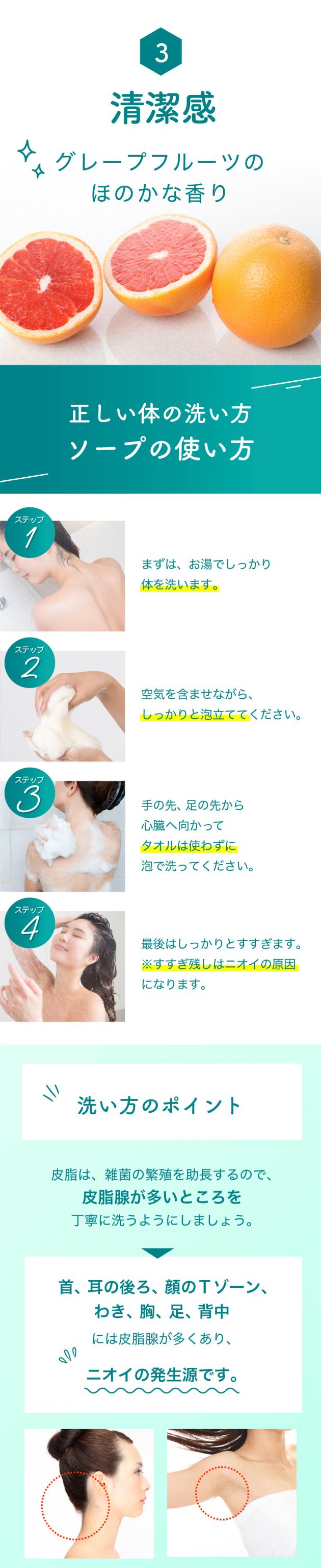 - 猛暑で毎日汗のニオイが気になるので、試しに購入。開ける前から爽やかなグレープフルーツのような柑橘ぽい香りがしていて期待していました。泡立ちなど問題ありませんが、やはり臭わないという感じはなりませんでした。