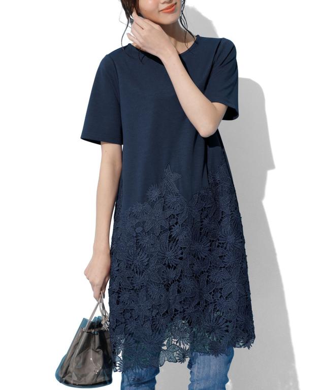 【新色追加】繊細なレースを使った見映えのするチュニック。ウエスト位置から切り替えたレースが体型カバーとおしゃれを兼備。接触冷感素材で夏に快適な着心地も。