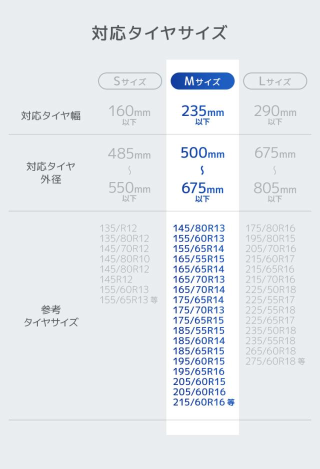 | 適合タイヤサイズ | タイヤ幅 290mm以下、外径 675〜805mm |