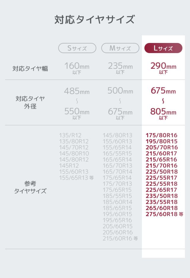 | 適合タイヤサイズ | タイヤ幅 290mm以下、外径 675〜805mm |