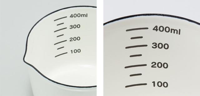 | 注ぎやすい 注ぎ口が付いているので軽量した物を移す時もこぼれにくく、注いだ後の液だれなどでキッチンを汚しにくいです。最後まで注げるので、繊細なお菓子のレシピにも忠実に計量ができます。 | 内側に目盛 商品の内側に目盛がついているので、デザイン性を損なうことなく機能を果たしてくれます。キッチンに吊り下げて飾っていただいてもオシャレです。 |