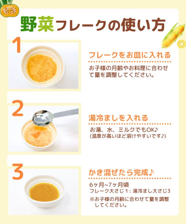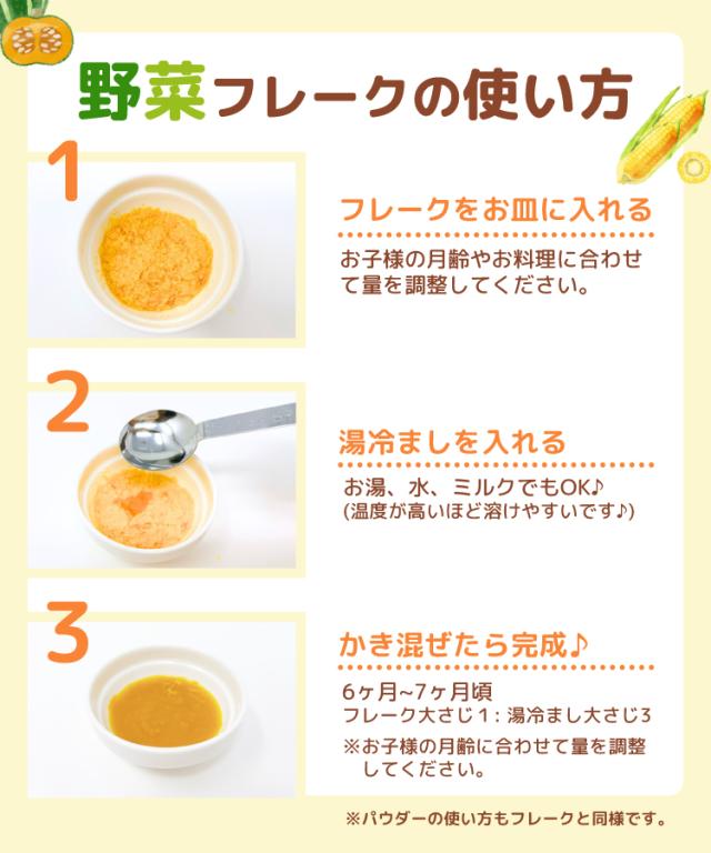 【内容量】じゃがいもフレーク(60g)×1袋・かぼちゃフレーク(50g)×1袋・スイートコーンパウダー(50g)×1袋・ほうれん草パウダー(40g)×1袋