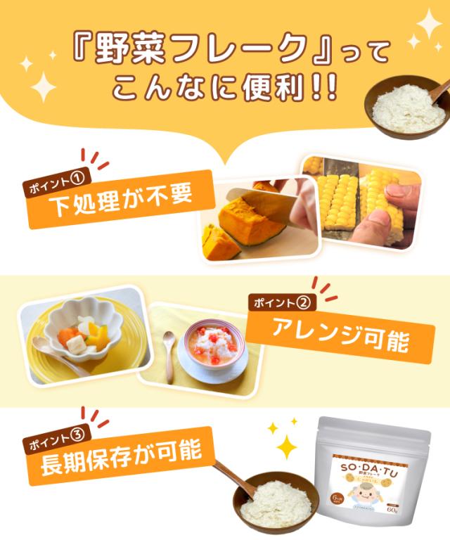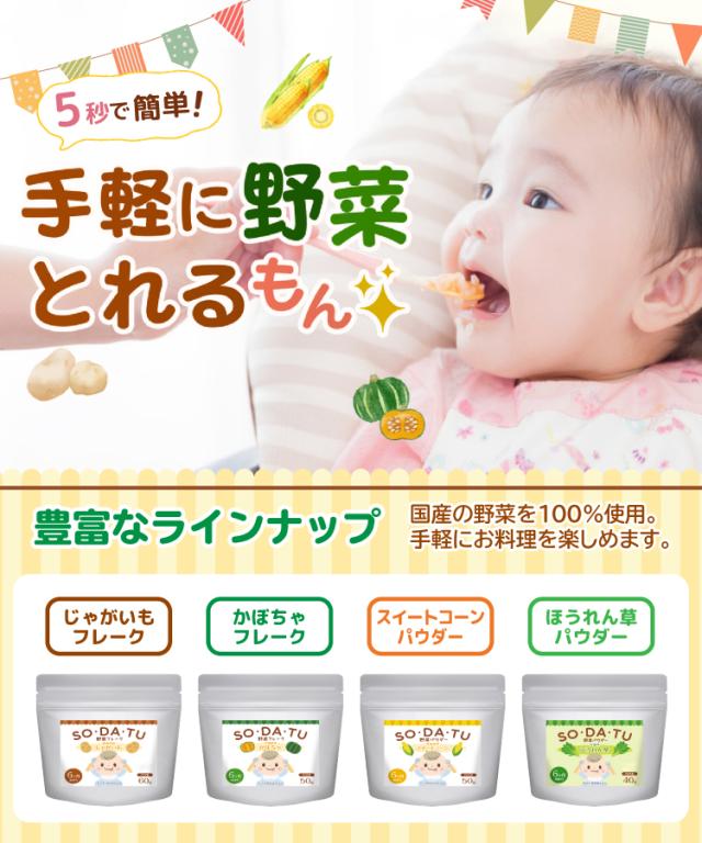 | 離乳食 初期 中期 後期 裏ごし ペースト 野菜フレーク 野菜パウダー 離乳食 幼児食 スープ じゃがいも かぼちゃ スイートコーン とうもろこし ほうれんそう レシピ 栄養 乳児用規格適用食品 無着色 100% 北海道産 お菓子 パン 色付け おすすめ 離乳食レシピ ベビーフード 6カ月 9カ月 1歳 7ヶ月 sodatu そだつ |