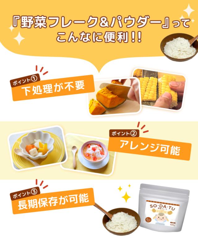 離乳食 野菜フレーク (お得な4袋セット) 野菜パウダー ベビーフード 6ヶ月 100% 北海道産 介護食 無着色 国産野菜 レシピ ほうれん草パウダー×1袋 じゃがいもフレーク60g×1袋 スイートコーンパウダー50g×1袋 かぼちゃフレーク50g×1袋 SO・DA・TU ママセレクト
