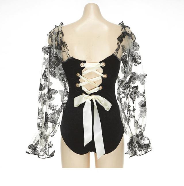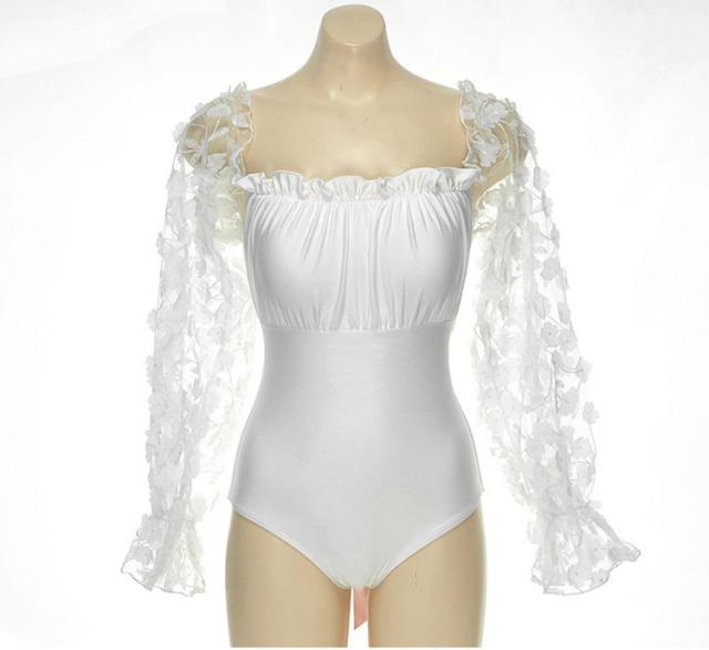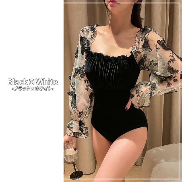 即納 水着 レディース ワンピース 体型カバー 可愛い お洒落 白 黒 オトナ女子 フリル シースルー 刺繍 シンプル 長袖 夏 フェミニン バックシャン バックリボン ガーリー リボン パッド付き 脚長効果 鎖骨 背中ノンワイヤー バスト 盛れる 肩 二の腕 ウエスト カバーアップ
