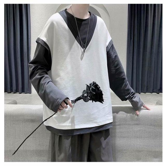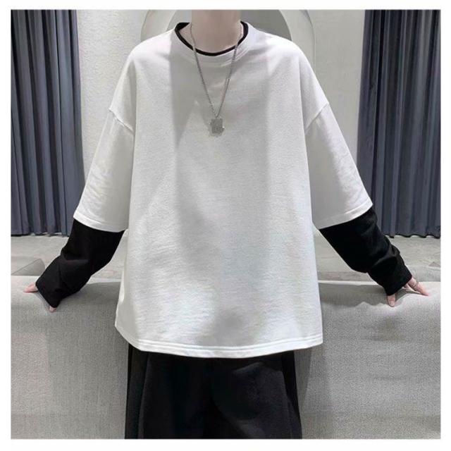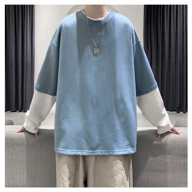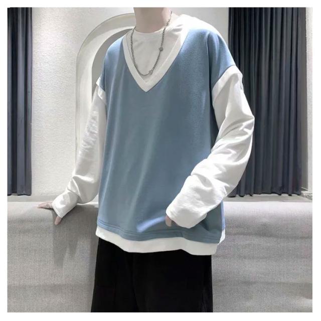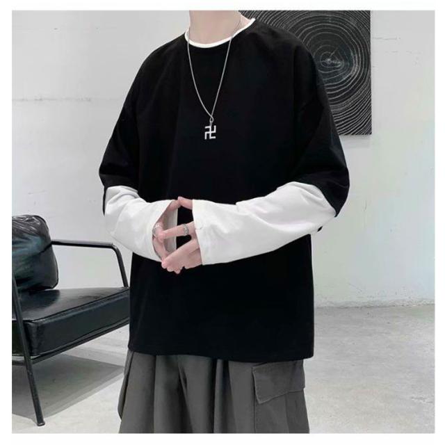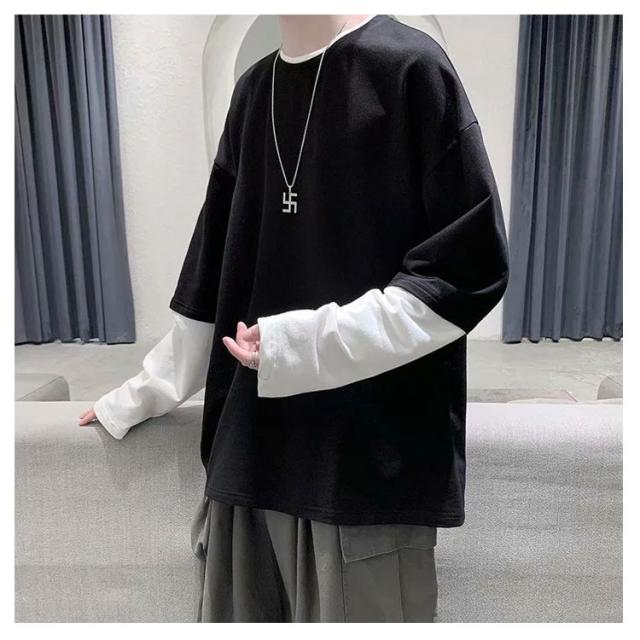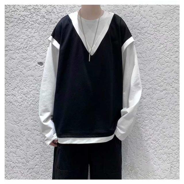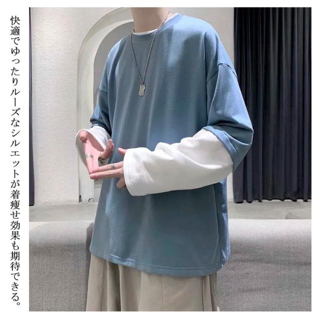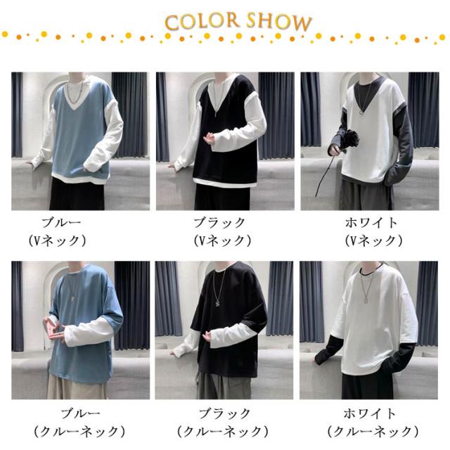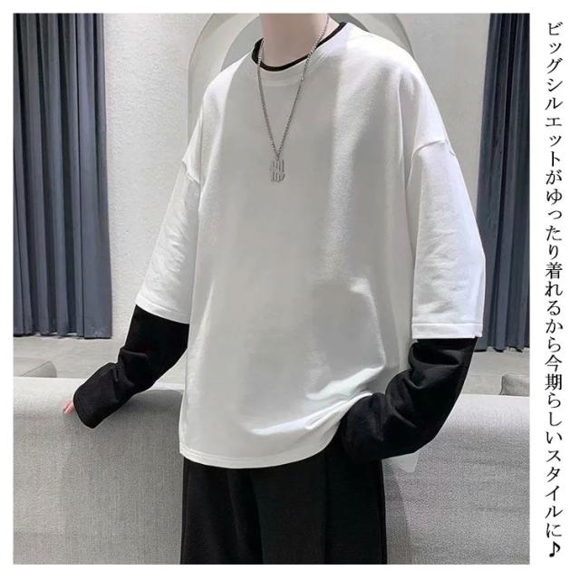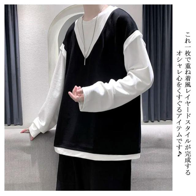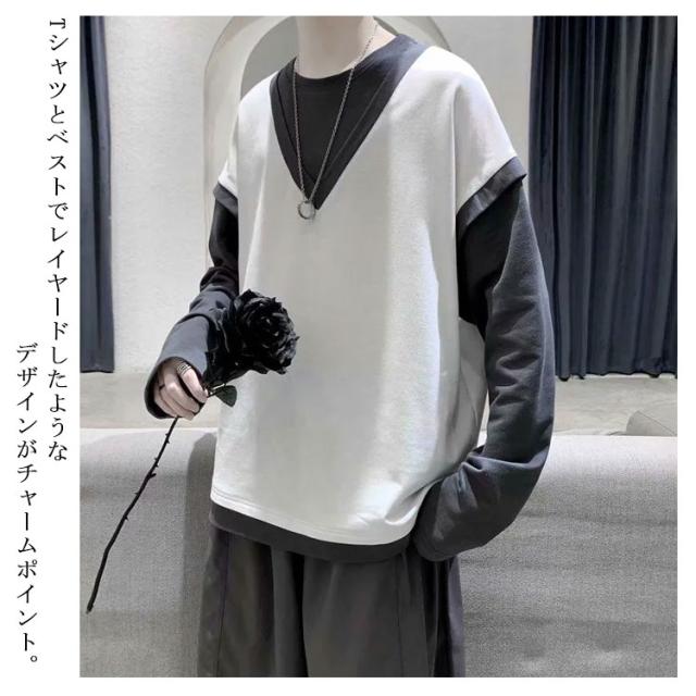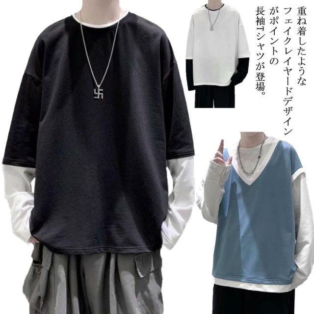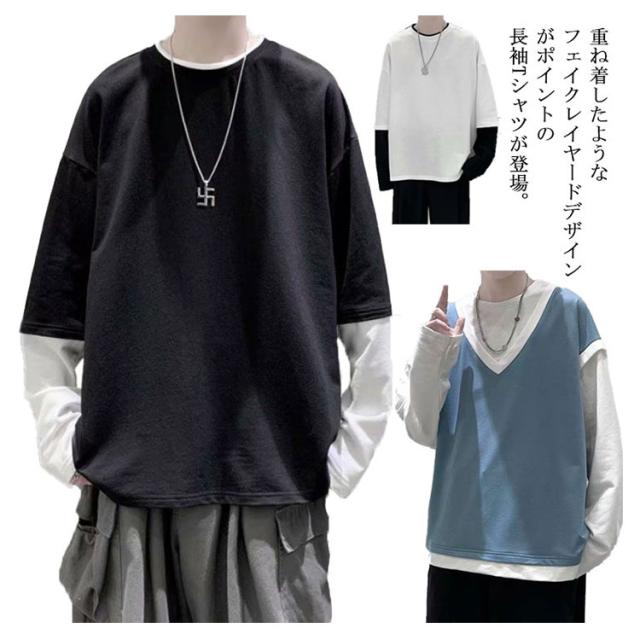 メンズ トップス 長袖Tシャツ カットソー フェイクレイヤード 重ね着風 ビッグシルエット メンズTシャツ オーバーサイズ ゆったり クルーネック Vネック ドロップショルダー 韓国ファッション お兄系