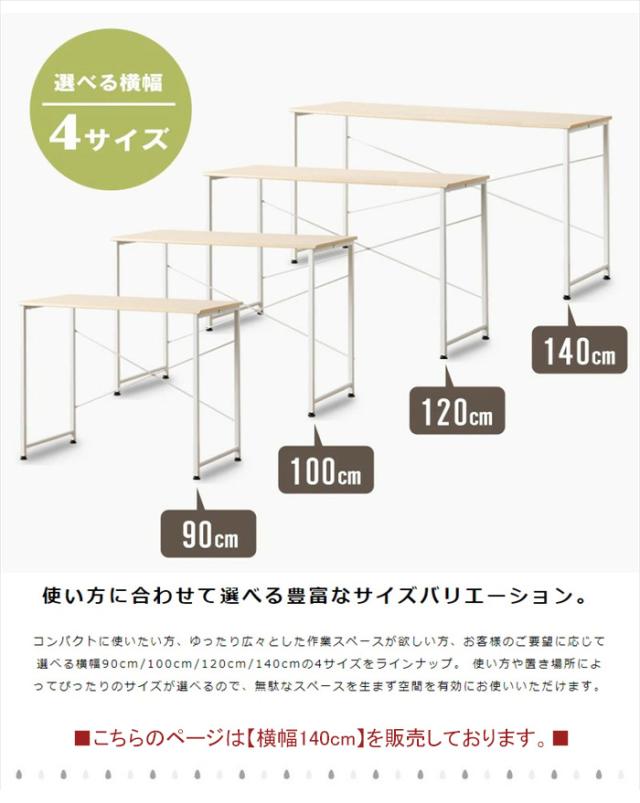| 使い方に合わせて選べる豊富なサイズバリエーション。 コンパクトに使いたい方、ゆったり広々とした作業スペースが欲しい方、お客様のご要望に応じて選べる横幅90cm/100cm/120cm/140cmの4サイズをラインナップ。 使い方や置き場所によってぴったりのサイズが選べるので、無駄なスペースを生まず空間を有効にお使いいただけます。 幅140cmタイプ:ゆったり広々としたワイドサイズ! 横に広い作業スペースを確保できるワイドなサイズで、デスクワークが楽々。 パソコン以外にも周辺機器や小物を置いたりと、ゆったりとお使いいただけます。 横長のサイズを生かして、お子様が2人並んで勉強机にしたり、他のサイズと組み合わせてL字型レイアウトして使用するなど、様々なシーンで活躍します。 |