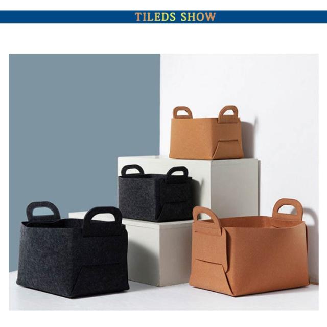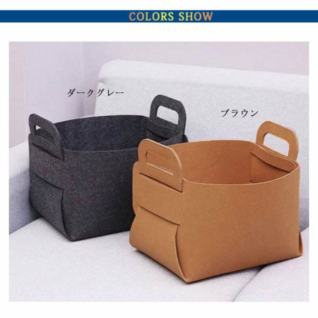 | 【商品名】フェルトバスケット 【素材】フェルト生地 【サイズ】展開時:S(18*13*11cm) M(25*18*15cm) L(36*25*23cm) XL(36*28*25cm) 【特徴】雑貨・リモコン・小物からおもちゃ、食品ストック、雑誌などなんでもバサッとたっぷり収納。フェルト生地は、中に収納したものを衝撃から保護する役割があります。硬いものを収納する場合、フェルトなので床を傷つけないのも嬉しいポイントです。インテリアに馴染むブラウンとダークグレーの2色を部屋に置いて、おしゃれに収納。使わない時は折り畳んでコンパクトに。 | |