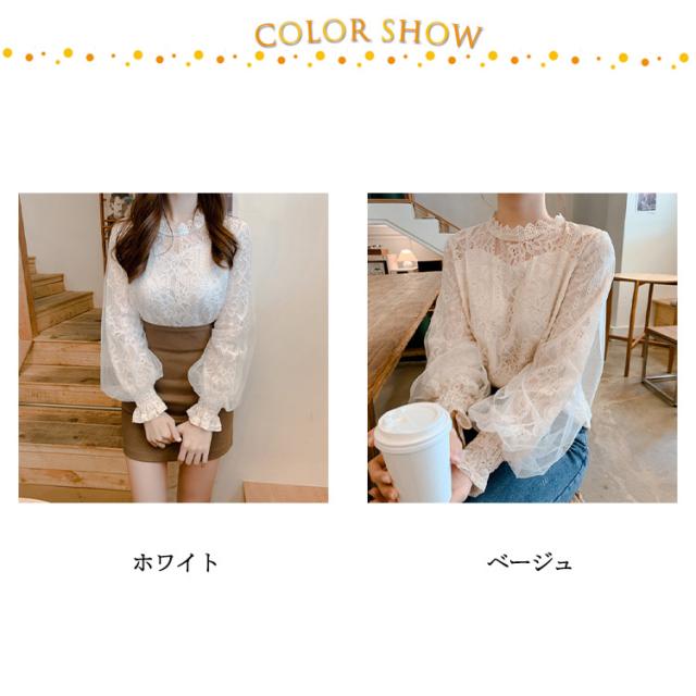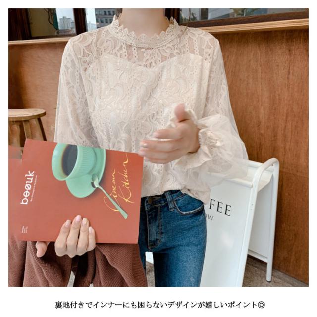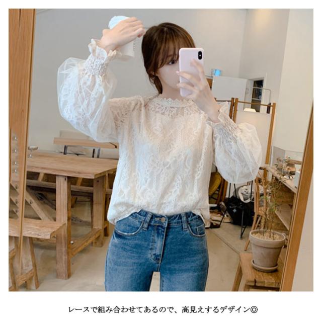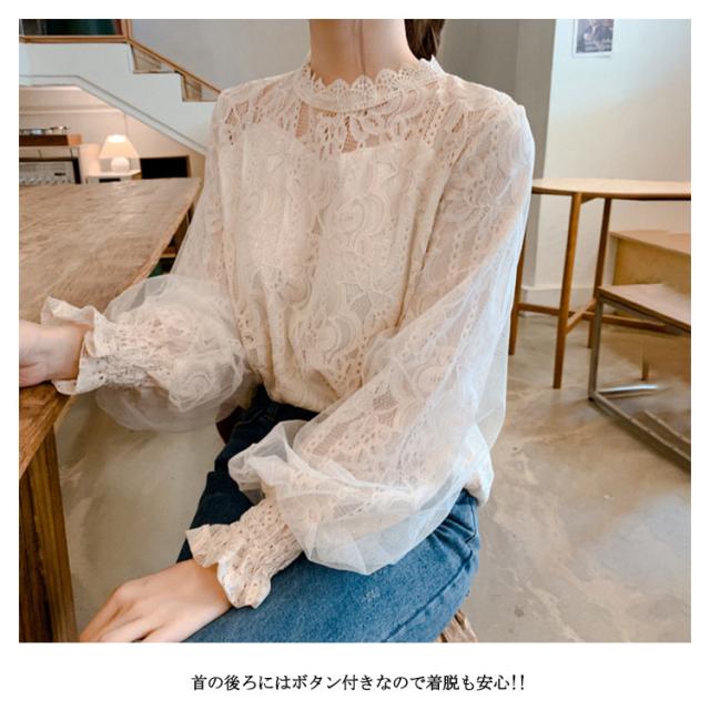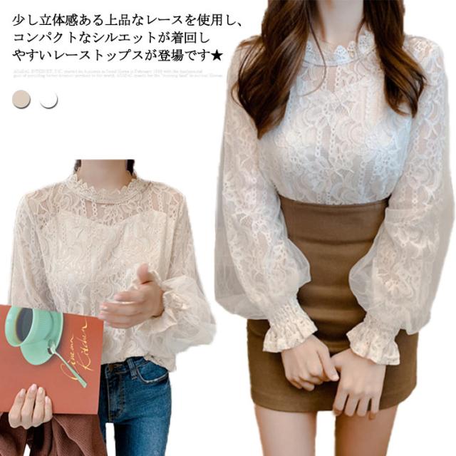レース トップス レディース 長袖 ブラウス 総レース 立ち襟 シャツ ブラウス 花柄 裏地付 高見え 可愛い バルーン袖 ロングブラウ 切り替え オフィス カジュアル オシャレ デート 韓国 ファッション