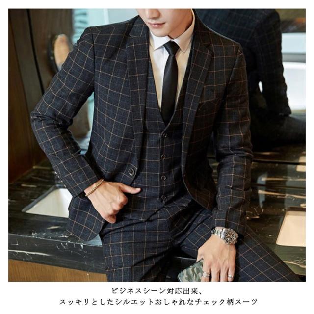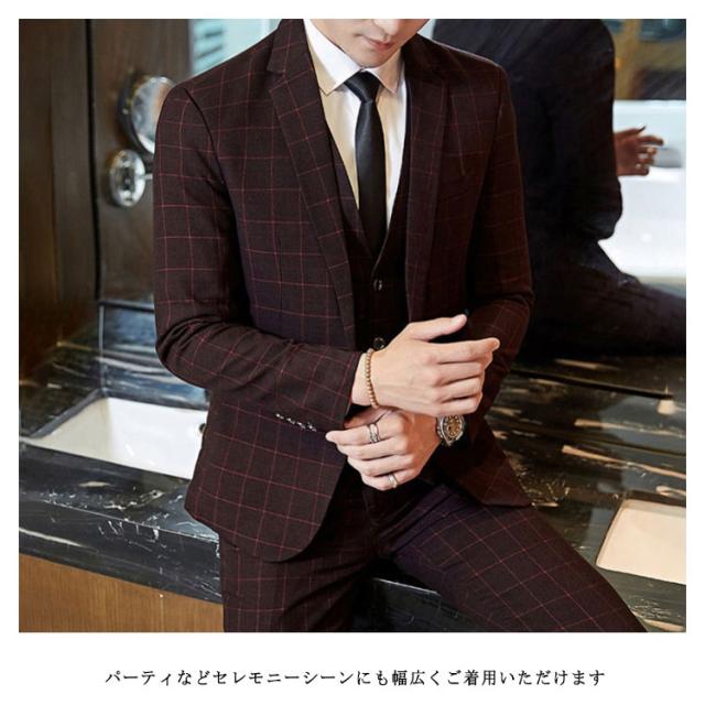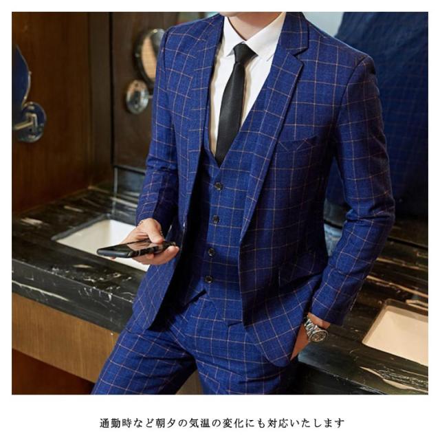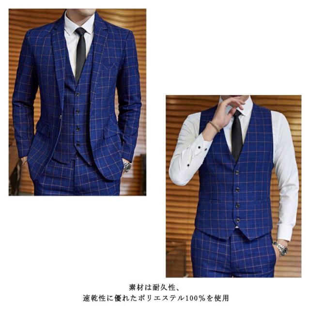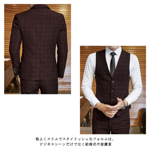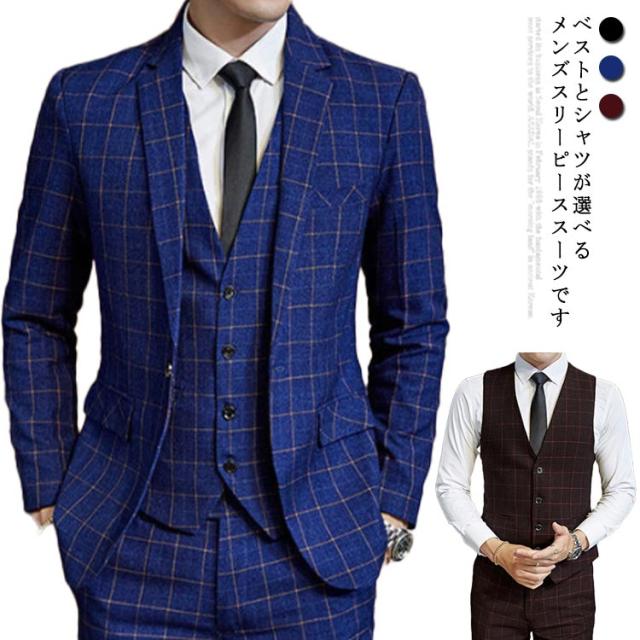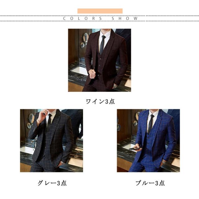 全3色×7サイズ!スリーピーススーツ メンズ チェック柄 3ピース 大きいサイズ 通勤 フォーマル ビジネススーツ スリムスーツ メンズスーツ 3点セット カジュアルスーツ パーティー セットアップ 細身 スタイリッシュ おしゃれ オシャレ 結婚式 成人式