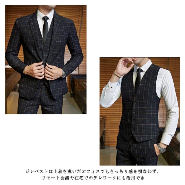 | ベストとシャツが選べるメンズスリーピーススーツです。 ビジネスシーン対応出来、スッキリとしたシルエットおしゃれなチェック柄スーツ。 ジレベストは上着を脱いだオフィスでもきっちり感を損なわず、リモート会議や在宅でのテレワークにも活用でき、 通勤時など朝夕の気温の変化にも対応いたします。 素材は耐久性、速乾性に優れたポリエステル100%を使用。 パンツはで家庭でも洗濯できるウォッシャブル、プリーツ加工でお手入れも簡単です。 程よくスリムでスタイリッシュなフォルムは、ビジネスシーンだけでなく結婚式や披露宴 パーティなどセレモニーシーンにも幅広くご着用いただけます。 | |