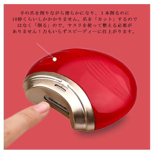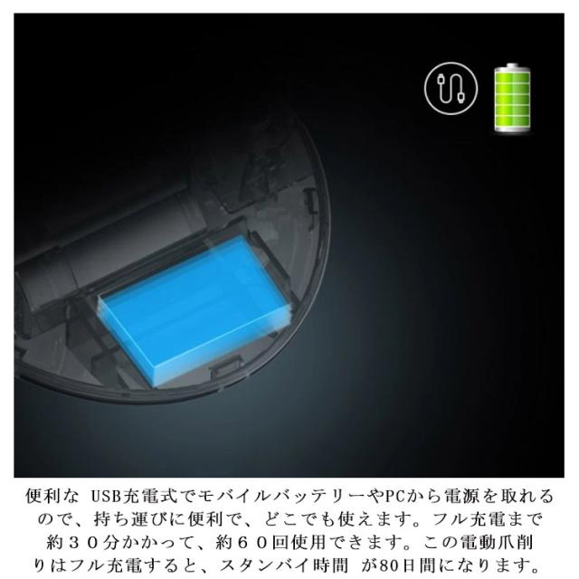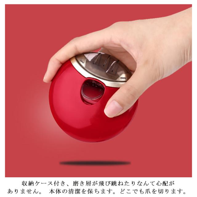 | ワンタッチ簡単操作 手の爪を削りながら滑らかになり、1本削るのに10秒くらいしかかかりません。爪を「カット」するのではなく「削る」ので、ヤスリを使って整える必要がありません!力もいらずスピーディーに仕上がります。 低騒音 作動しているときには、50db以下の低騒音で、静か です。 USB充電式 便利な USB充電式でモバイルバッテリーやPCから電源を取れるので、持ち運びに便利で、どこでも使えます。フル充電まで約30分かかって、約60回使用できます。この電動爪削りはフル充電すると、スタンバイ時間 が80日間になります。 掃除不要 収納ケース付き、磨き屑が飛び跳ねたりなんて心配がありません。 本体の清潔を保ちます。どこでも爪を切ります。 コンパクトで持ち運び便利 コンパクト仕様で、スペースを取らず、自宅ではもちろん、 外出先、旅行先でもお気軽にあなただけのネイルライフを楽しむことができます! お子様やお年寄りの介護時にも非常におススメです。 | |