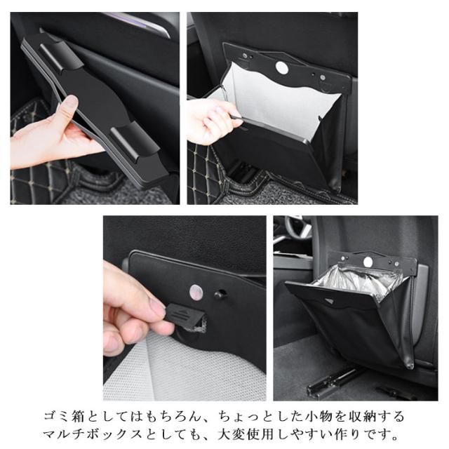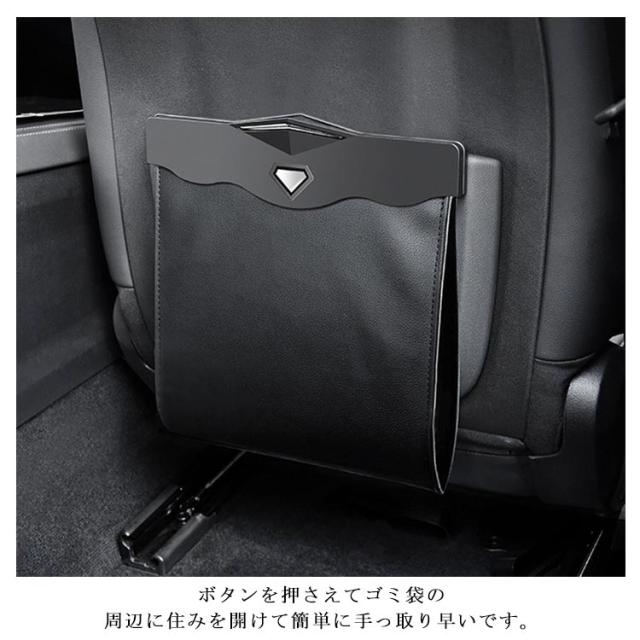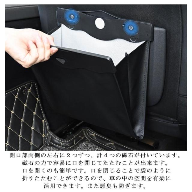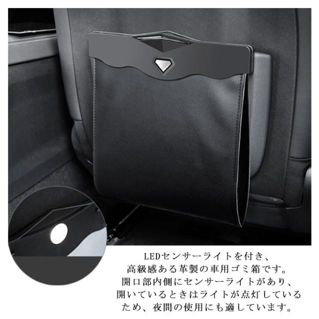 | 使用簡単 ボタンを押さえてゴミ袋の周辺に住みを開けて簡単に手っ取り早いです。 LEDセンサーライト LEDセンサーライトを付き、高級感ある革製の車用ゴミ箱です。 開口部内側にセンサーライトがあり、開いているときはライトが点灯しているため、夜間の使用にも適しています。 磁石付きデザイン 開口部両側の左右に2つずつ、計4つの磁石が付いています。 磁石の力で容易に口を閉じてたたむことが出来ます。口を開くのも簡単です。口を閉じることで袋のように折りたたむことができるので、車の中の空間を有効に活用できます。また悪臭も防ぎます。 収納便利 ゴミ箱としてはもちろん、ちょっとした小物を収納するマルチボックスとしても、大変使用しやすい作りです。 | |