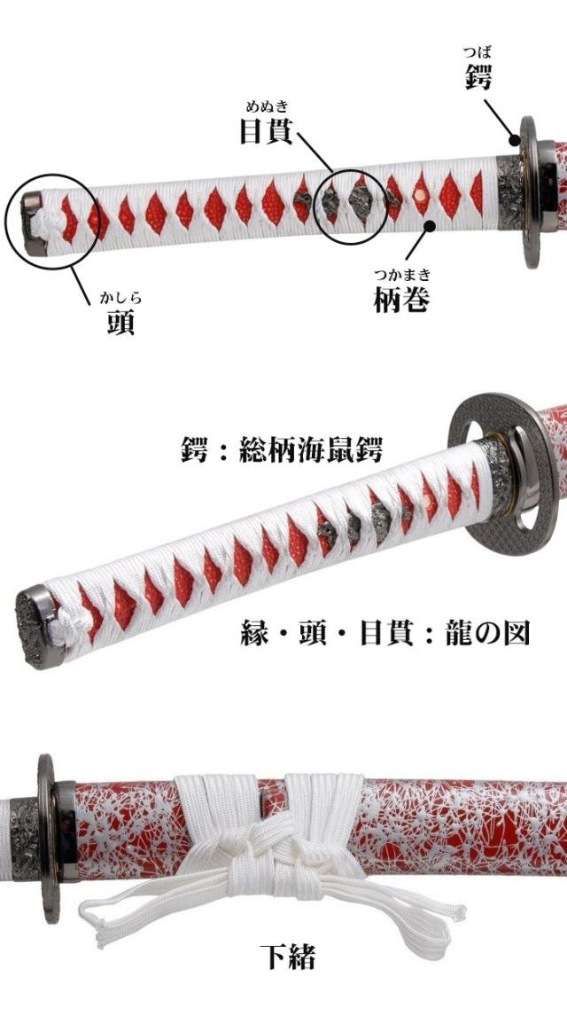| 〔鞘〕朴の木 〔柄〕プラ製(赤鮫) 〔金属〕合金 〔下緒〕人絹 白糸 〔柄糸〕人絹 白糸 |