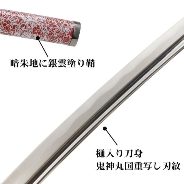 | 〔刀身〕樋入り刀身 〔刃紋(刃文)〕鬼神丸国重写し刃紋 〔鞘(さや)〕暗朱地に銀雲塗り鞘 〔鍔(つば)〕総柄海鼠鍔 〔縁・頭・目貫(めぬき)〕龍の図 |