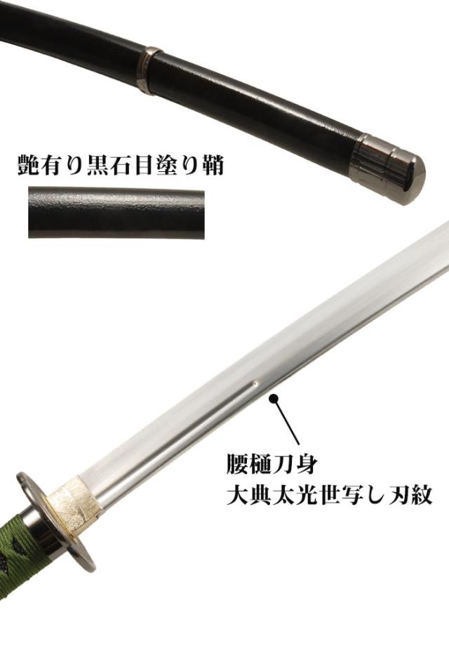 | 〔刀身〕腰樋刀身 〔刃紋(刃文)〕大典太光世写し刃紋 〔鞘(さや)〕艶有り黒石目塗り鞘 〔鍔(つば)〕地紋木工鍔 〔縁・頭・目貫(めぬき)〕無地半太刀金具、竜図目貫 |