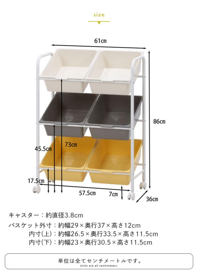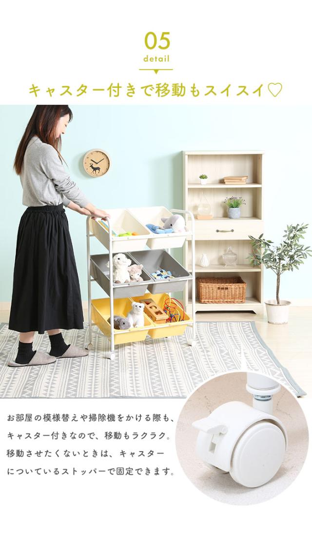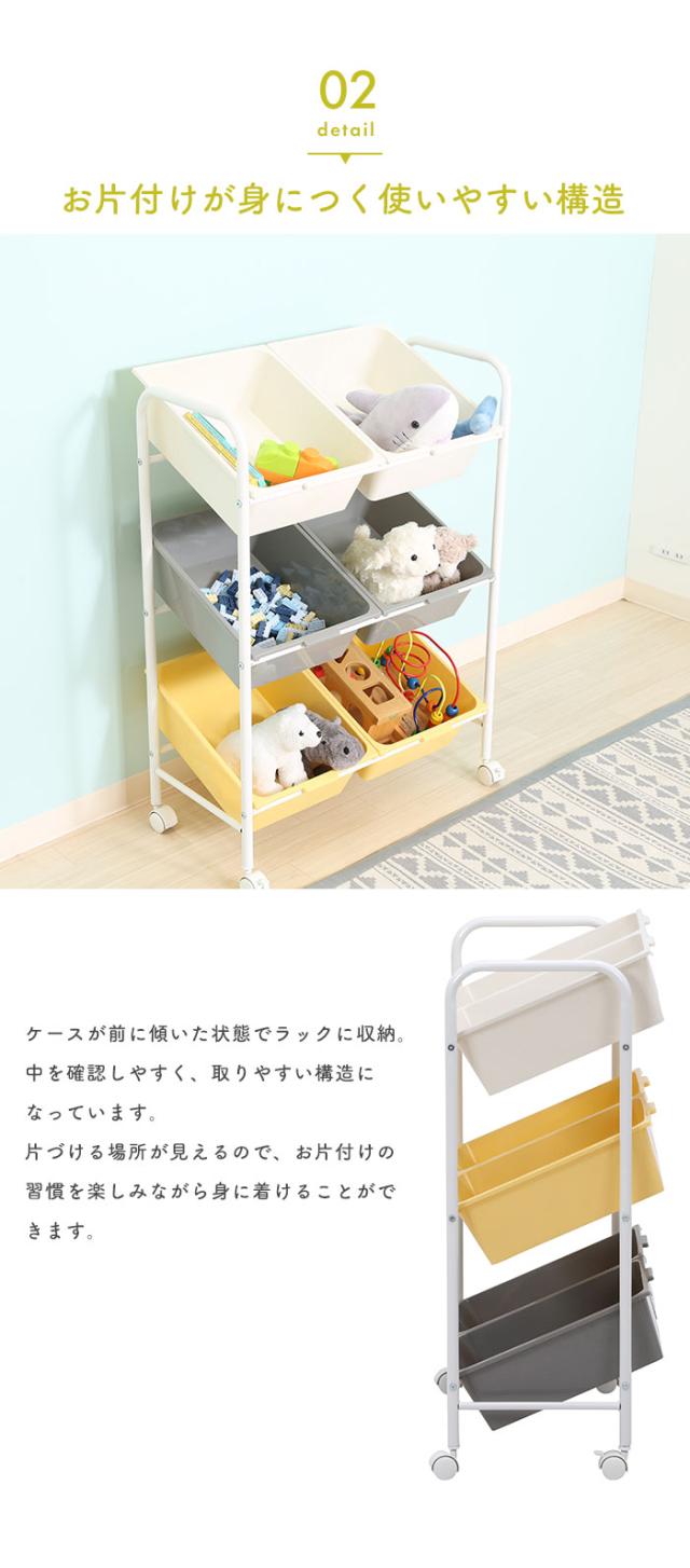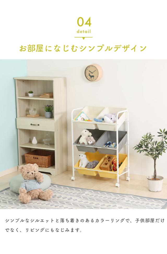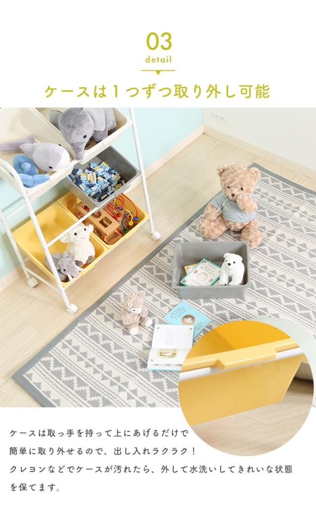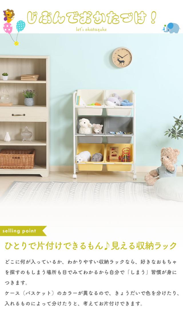 | おもちゃや洋服を収納できるおしゃれなキッズラック。 どんどん増えていくおもちゃやぬいぐるみ、散らかりがちな小物類もたっぷり収納できます。 ケースが前に傾いているので、中を確認しやすく、取出しやすい構造。 どこに何が入っているか、わかりやすい収納ラックなら、好きなおもちゃを探すのもしまう場所も目で見てわかるから自分で「しまう」習慣が身につきます。 ボックス(バスケット)のカラーが異なるので、きょうだいで色を分けたり、入れるものによって分けたりと、考えてお片付けができます。 ケースは取っ手を持って上にあげるだけで簡単に取り出せるので、出し入れラクラク。汚れたら水洗いOK。 機能面だけでなく、見た目もおしゃれ!シンプルなシルエットと落ち着きのあるカラーリングで、子供部屋だけでなくリビングにもなじみます。 キャスター付きで移動もスイスイ。移動させたくないときはキャスターについているストッパーで固定できます。 |