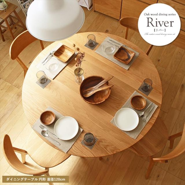 | 天然木オーク材をふんだんに使用したぬくもり溢れるデザインで、 ダイニング空間を優しく包み込むダイニング家具シリーズ「リバー」。 家族で囲める円形ダイニングテーブル。 家族のだんらんや、友人を招いて楽しい時間を過ごせる円形ダイニングテーブルです。 天板のサイズは、大人4人で着席しても適度な距離感が保てる直径120cm。 |