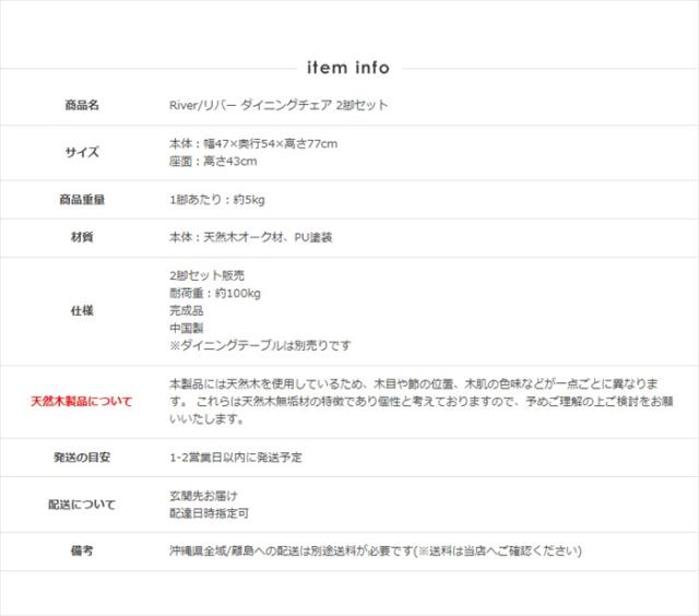 | ◇2脚セット販売 ◇耐荷重:約100kg ◇完成品 ◇中国製 ※ダイニングテーブルは別売りです。 【天然木製品について】 本製品には天然木を使用しているため、木目や節の位置、木肌の色味などが一点ごとに異なります。 これらは天然木無垢材の特徴であり個性と考えておりますので、予めご理解の上ご検討をお願いいたします。 |