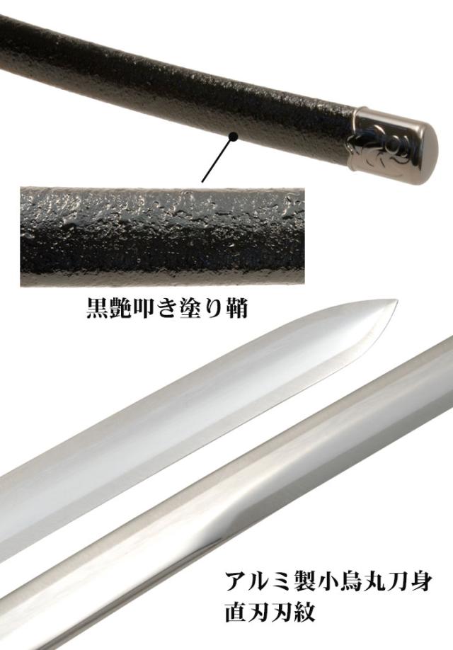 | 〔刀身〕アルミ製小烏丸刀身 〔刃紋(刃文)〕直刃刃紋 〔鞘(さや)〕黒艶叩き塗り鞘 〔鍔(つば)〕木瓜型太刀鍔 〔縁・頭・目貫(めぬき)〕太刀用頭金具、太刀用縁金具 |