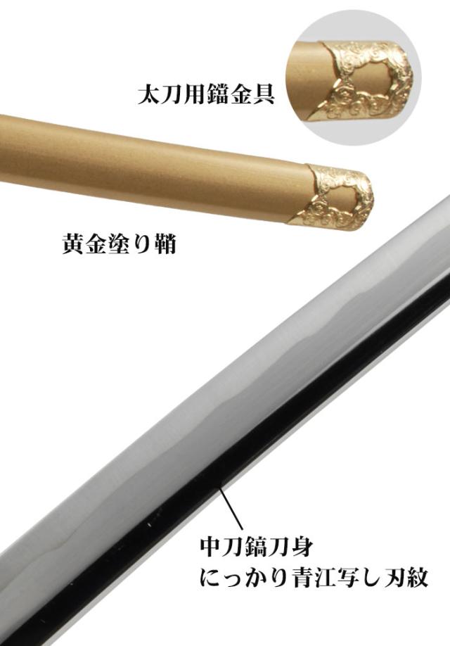 | 〔刀身〕中刀鎬刀身 〔刃紋(刃文)〕にっかり青江写し刃紋 〔鞘(さや)〕黄金塗り鞘 〔鍔(つば)〕木瓜地紋金鍔 〔縁・頭・目貫(めぬき)〕竜図金具 |