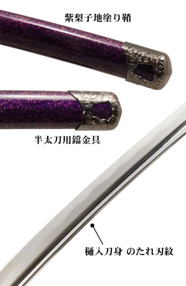 | 〔刀身〕樋入刀身 〔刃紋(刃文)〕のたれ刃紋 〔鞘(さや)〕紫梨子地塗り鞘 〔鍔(つば)〕喰出鍔 〔縁・頭・目貫(めぬき)〕龍の図 |