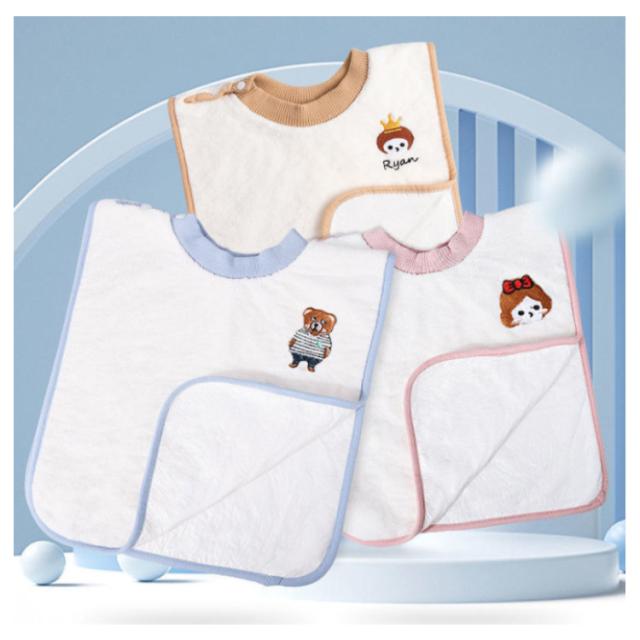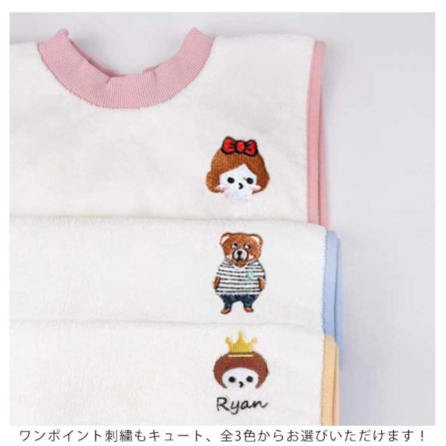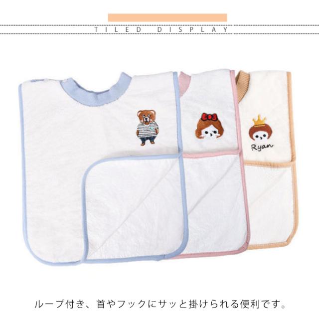 | 保育園や幼稚園でのご使用にぴったりなタオルエプロン! ループ付き、首やフックにサッと掛けられる便利です。 表面はふわふわ素材で、裏面防水素材で、速乾性と吸水性に優れています。 食事の時はもちろん、歯磨きのトレーニングにおすすめです。 ワンポイント刺繍もキュート、全3色からお選びいただけます! | |