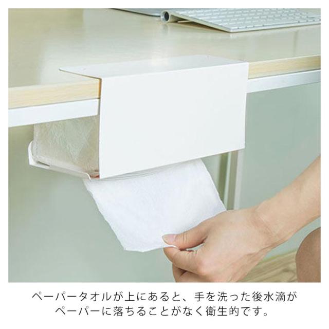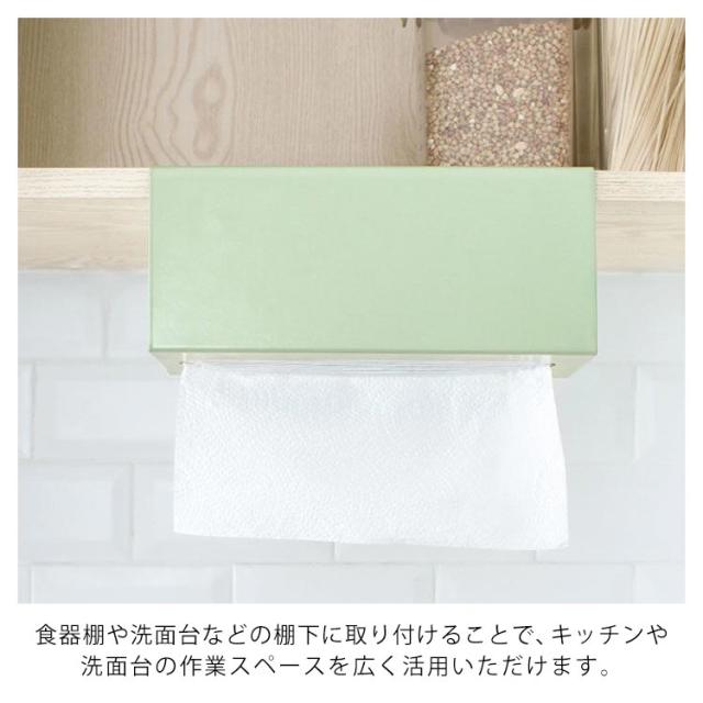 | 吊り戸棚やデスクに挟むだけ! デッドゾーンを有効活用! とっても便利なキッチンペーパーホルダーです。 ペーパータオルが上にあると、手を洗った後水滴がペーパーに落ちることがなく衛生的です。 食器棚や洗面台などの棚下に取り付けることで、キッチンや洗面台の作業スペースを広く活用いただけます。 棚が支えになるので、ペーパーをサッと引き出せます。 様々な大きさのペーパーに対応。 スチール製で耐久性も安定性も抜群です。 | |
